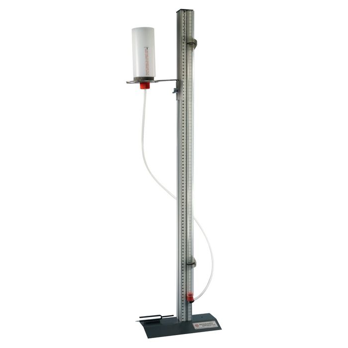 A simple 'Resonance Apparatus'. Consists of a 1m long vertical stand with metric scale and a 20mm plastic tube connected to a 1L vessel of water. The vessel of water is placed so that the level of water in the tube is adjustable by raising and lowering the vessel. A tuning fork is provided to check for resonance by listening at the mouth of the tube as the level is adjusted. The various lengths of the air column where resonance is evident are marked and calculations are made to determine the wavelength and frequency of the tubbing fork.