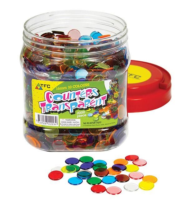 This set of round transparent counters16mm consists of 2000 transparent pieces in 10 colours. The translucent counters come in a jar for easy storage and transport. Each counter measures 16mm in diameter.
