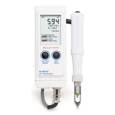 HI 99163 is a portable pH/temperature meter designed for the meat processing industry to ensure a quality product. The FC 232D pre-amplified pH electrode and removable stainless steel blade enables users to perform unintrusive measurements on meat products inside and out. The free diffusion junction helps to avoid a clogged reference and the external body material is non-toxic and food compatible.