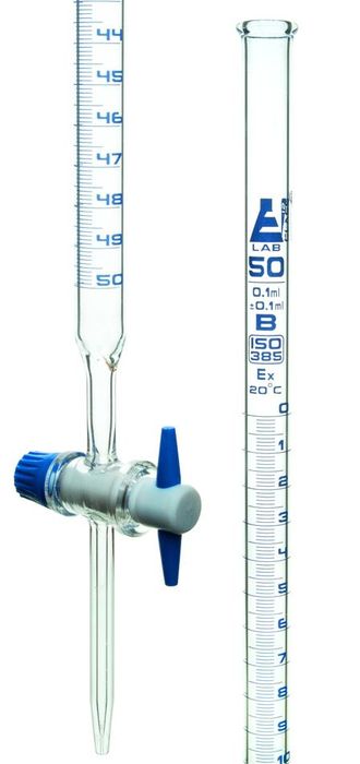 With straight bore interchangeable PTFE Key stopcock. Accuracy as per DIN ISO 385, ASTM-E287 standard. Graduation in blue colour.