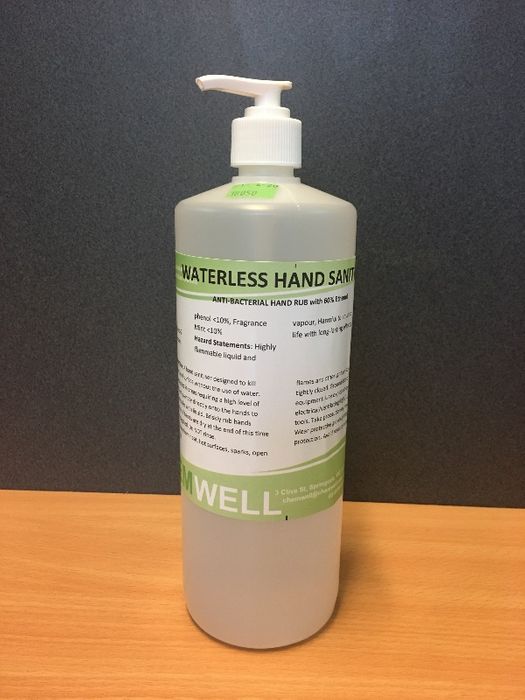 Waterless Hand Sanitiser with 60% ethanol and 20% chlorhexadine.