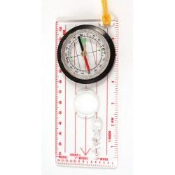 For reading of topographical and tourist maps and determination of azimuthal location of a given place. Suitable for overhead projection. Compact 2” (50mm) diameter compass is graduated from 0° to 360° in 2° increments, has a liquid-filled capsule, declination correction scale, and luminous points. Meridian lines help in accurate plotting of angles. Magnifier with 4x magnification and 4 stencil cuts are built into the base. Transparent acrylic base has 3 scales in cm, 1:25000, and 1:50000. Base Size: 2-1/2”x5-1/2” (60x140mm). Comes with a yellow lanyard in blister packaging.