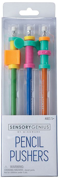 Bring life to your pencils with these brightly colored fidget accessories. Set includes three pencils in orange, blue and green and three multi-colored “pushers”.