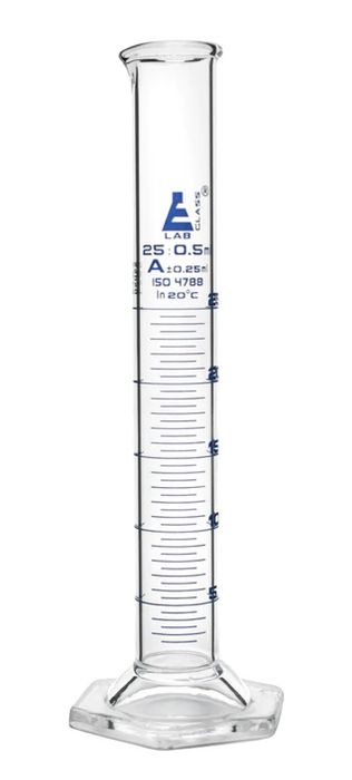 The sturdy borosilicate glass 25mL graduated cylinder is ideal for measuring liquids up to 25mL in capacity. The graduation markings (0.5ml) make it easy to read liquid levels and the spout allows for liquids to be poured from the vessel with little spillage.