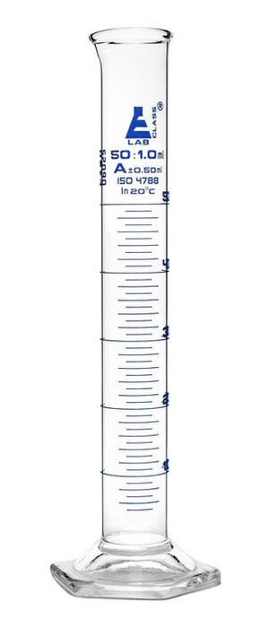 The sturdy borosilicate glass 50mL graduated cylinder is ideal for measuring liquids up to 50mL in capacity. The graduation markings make it easy to read liquid levels and the spout allows for liquids to be poured from the vessel with little spillage.