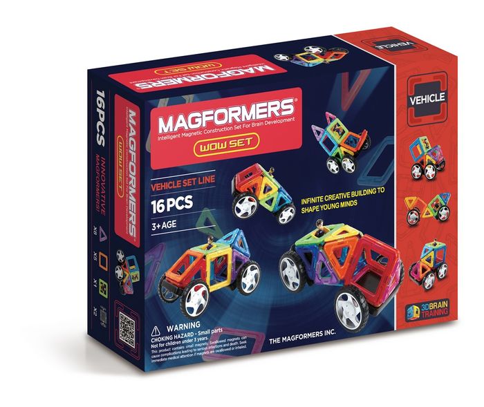 The set includes 14 standard Magformers pieces (squares and triangles) and 2 sets of wheels.