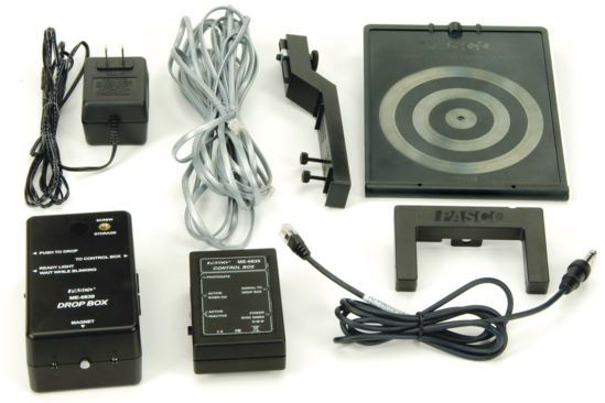 Before it falls, the target is attached to the drop box by a permanent magnet so it can hang indefinitely, even when the drop box is not powered. A photogate detects the projectile as it leaves the launcher and triggers the drop box. The drop box releases the target by driving a current through a coil that cancels the field of the permanent magnet.