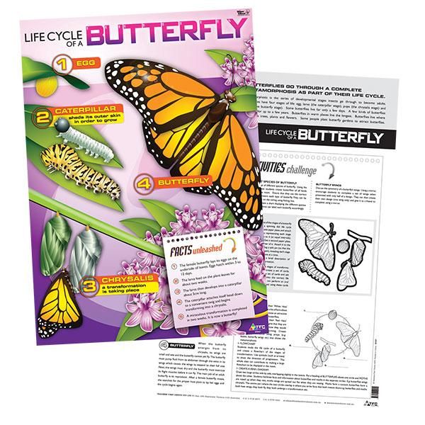 Discover the different stages of the butterfly life cycle with these colourful pictures. Features a teacher resource guide with display and activity ideas on the back. 43 x 55cm.