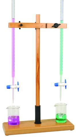 For two burettes, Made of seasoned hardwood, polished, with clamping screws. Rods are approx. 460 x 16 mm. Double base size 290 x 100 mm