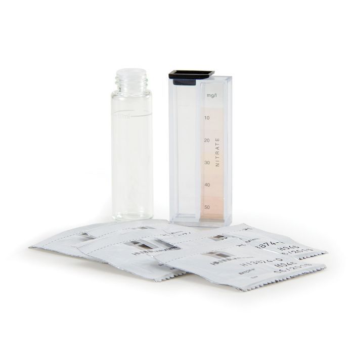 Nitrate ions are present in trace amounts in surface water and in higher levels in some groundwater. Nitrate is found only in small quantities in domestic wastewater but can reach higher concentration (up to 30 mg/L as nitrogen) in the outflow of nitrifying biological treatment plants. Excessive amounts can contribute to methaemo-globinemia: infant death and adult illness. In order to prevent this, a 10 mg/L limit (as nitrogen) has been imposed on drinking water. HI 3874 test kit comes with 100 packets nitrate reagent, glass cuvette and color comparison cube.Order Information: