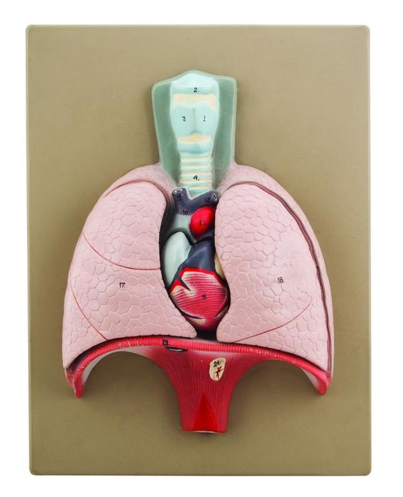 Economical model shows larynx wind pipe with bronchial tree, heart, subclavian artery and vein, venacava, arota, pulmonary artery, oesophagus, 2 lungs front halves removable and diaphragm. Supplied with English Key Card.