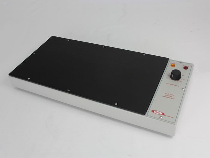 This slide warming tray has a 450 x 250 mm. anodised aluminium heating plate mounted on a powder coated steel base. Use of a one piece pad type element bonded to the heating plate ensures that an even heat is maintained within the working area of 400 x 200mm. Temperature setting is by an analogue control on the front panel, with indicators for power on, and heating on. The WT1 has a temperature range of approximately 28°C to 80°C (min 5°C above ambient) and can be used for a variety of purposes. For safety a thermal cut out is fitted, this will remove power to the element in the event of overheating due to control failure.