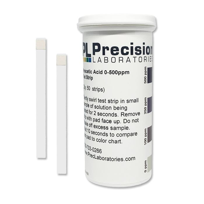 This test strip is calibrated at 0, 100, 250, and 500ppm, and gives results in just seconds. Peracetic acid is another sanitizing agent primarily used in some segments of the food industry, such as organic produce and poultry. The recommended strength of peracetic acid for a germicidal effect is typically 150-200ppm.