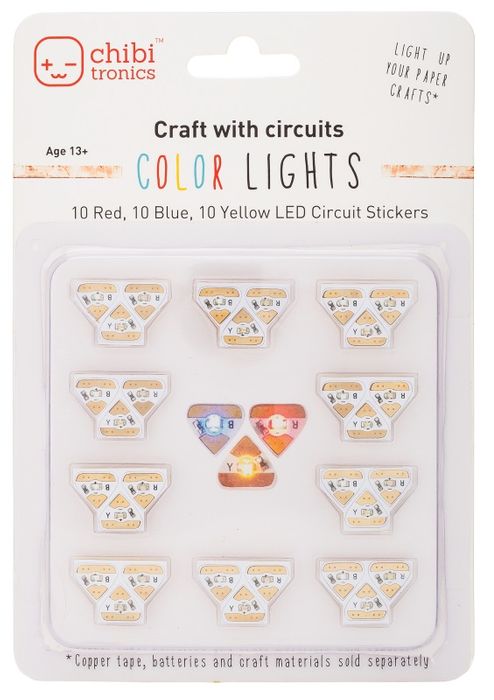 Color your world with Chibitronics MegaPack of 30 circuit stickers - 10 red, 10 yellow, and 10 blue.