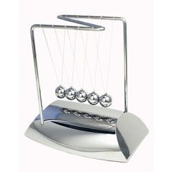 Our Newton’s Cradle got a facelift! Newton’s Cradle is a device that demonstrates conservation of momentum and energy Pull back one or more of the balls and let them drop down. The same number of balls will swing up on the opposite side and the clicking will go back and forth until it stops. Approx 3/4" (19mm) steel balls. Tangle-free packaging! Comes with a Teacher's Guide.