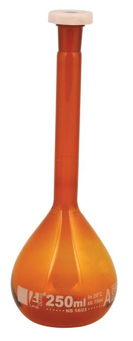 250ml capacity volumetric flask made of high quality, heavy duty Borosilicate 3.3 glass. Amber color for light sensitive solutions. Single, white graduation mark. Class A, tolerance, ±0.150ml. Fitted with a chemical resistant, 14/23 polypropylene stopper.