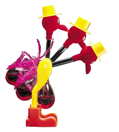 Drinking Bird works using properties of thermodynamics, converting thermal energy into mechanical energy. Fluid inside condenses from the evaporative cooling of the water off the birds beak, making it top heavy and dunking it back into the water. The condensate rejoins the liquid pool in the birds bulb, and he tips up again. Process continues indefinitely.