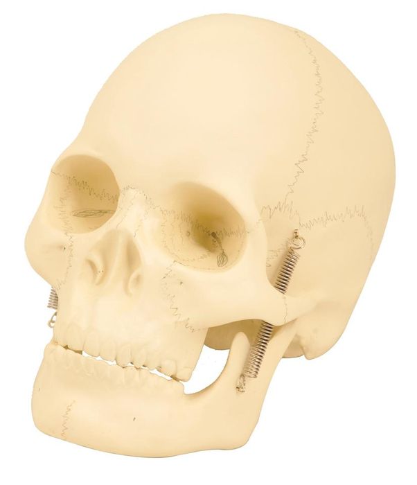 This basic human skull model is made of a fiber material and is natural color. The lower jaw is removable.