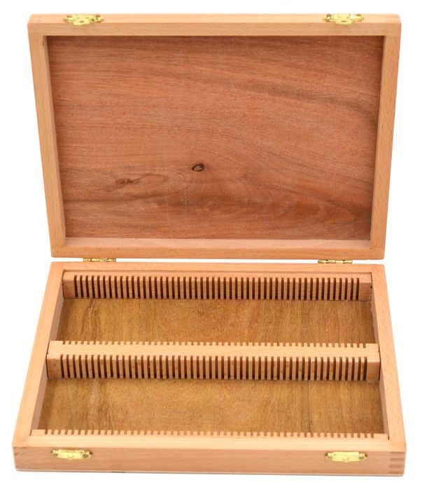 This Eisco Wooden Slide Box is built to store up to one hundred 75x25mm microscope slides. The heavy duty wooden planks act as pressure plates to secure slides better than some plastic versions. It's durable wooden shell is fastened with a metal hinge for a reliable closure in between uses.