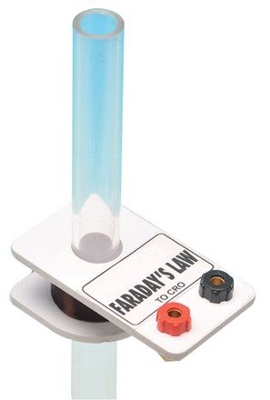 An assembly supports a coil so that it can be easily slide up and down a support tube and locked in position. When a small cylinderical magnet (supplied) is dropped down the tube, the resultant induced EMF can be monitored with an oscillioscope or data-logger. The amplitude varies with speed and this provides the basis for a student investigation into the relationship between distance fallen by the magnet and the output amplitude. At post-16, equations of motion can be used to determine the speed and if a PC storage oscillioscope is available, there is scope for investigation of output characteristics.