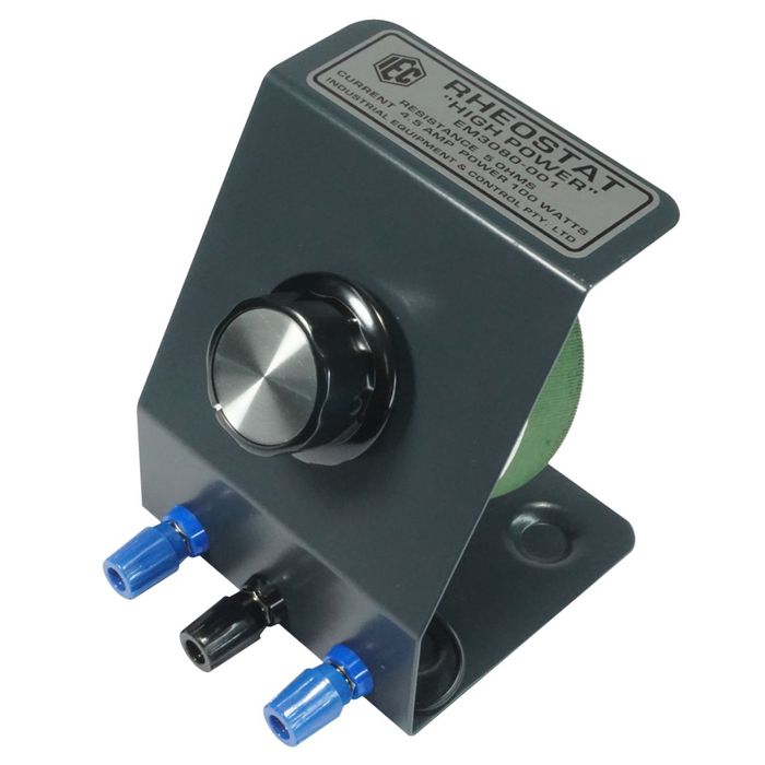 The IEC Rotary Rheostat / Potentiometer is for low resistance and high power. It is useful in the classroom where larger currents are required. Resistance is 5 ohms and power dissipation is 100 watts. This calculates to a permissible current of about 4.5 amps. The unit is fitted with 3x 4mm spin free IEC terminals so it can be used as either a rheostat (variable resistor) or a potentiometer.