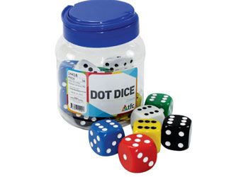 A set of 16 colourful dot dice, supplied in a handy jar for easy storage. Each dice measures 25mm. Supplied in assorted colours.