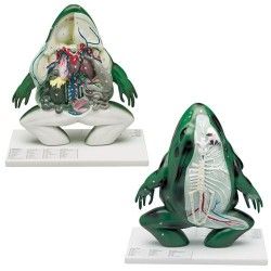 The perfect tool for teaching frog anatomy to any science or biology classroom. It is large enough to be seen from the back of the classroom and detailed enough to warrant close-up study. Features both ventral and dorsal dissections. Ventral side displays the digestive, respiratory, circulatory, and system. Also includes liver, gallbladder, two egg masses and vomerine teeth. Dorsal side exposes the brain, central nervous system, and eyeball. Both sides reveal the skeletal and muscular system. A total of 67 structures are numbered and referenced in keys on the two-sided base. Approx dimensions: 15-1/2" H x 12-1/2" W x 6" D (380x317x150mm). -