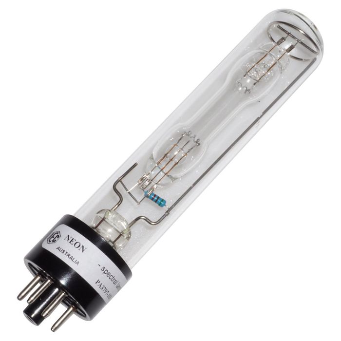 Spectral Lamp, Neon, new style with octal (8 pin) base, 30x140mm DxL. Only 4 pins out of the possible 8 pins are used. External starter is not required. Tube suits either Spectral Lamp Holder HL3796-101 or the new Spectral Lamp P/Supply with integral tube HL3794-001