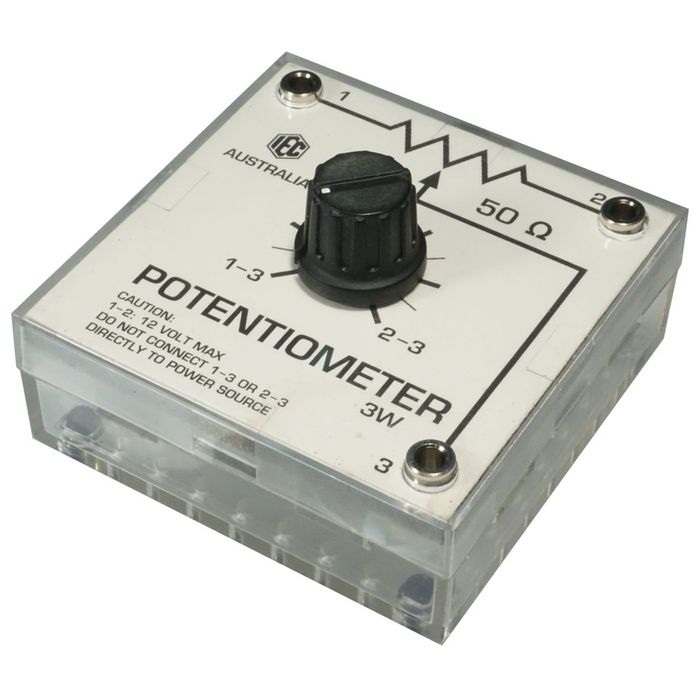 The IEC small radio type rotary Potentiometer is either wire wound or carbon track - depending on the resistance value. The housing is the same as used in the excellent IEC "Electricity Kit" 1763-001 with 4mm sockets for connection. It is designed for use in the hands of students and is tough and long lasting. Values can be 20, 50, 100, 1000, 10,000 ohms as a wire wound potentiometer type. Values can be 25,000, 50,000, 100,000 ohms as a carbon track potentiometer type.
