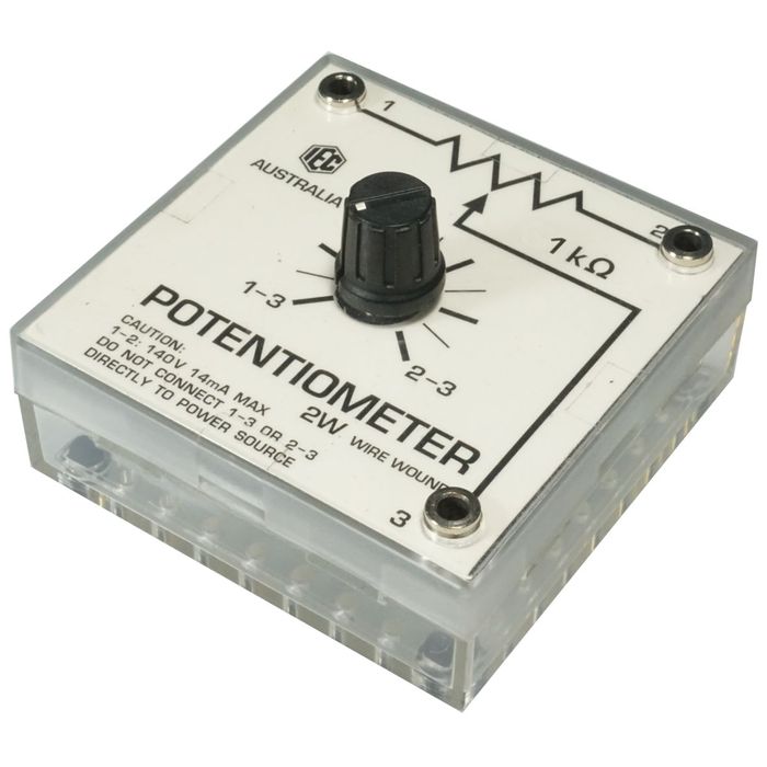 The IEC small radio type rotary Potentiometer is either wire wound or carbon track - depending on the resistance value. The housing is the same as used in the excellent IEC "Electricity Kit" 1763-001 with 4mm sockets for connection. It is designed for use in the hands of students and is tough and long lasting. Values can be 20, 50, 100, 1000, 10,000 ohms as a wire wound potentiometer type. Values can be 25,000, 50,000, 100,000 ohms as a carbon track potentiometer type.