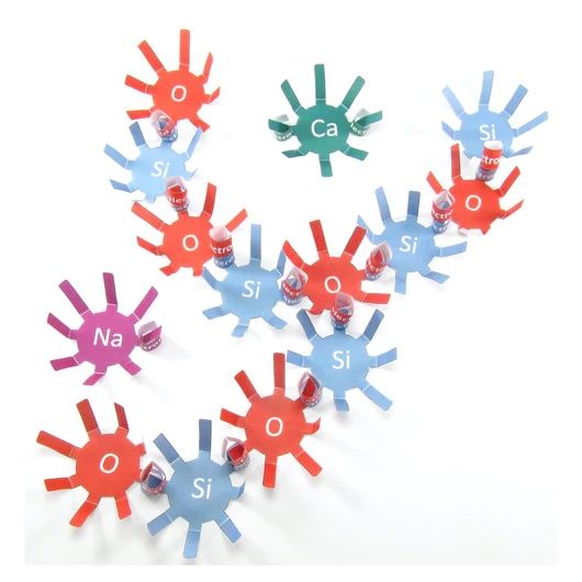 Your students first build easy to make paper models of atoms and electrons. Then, they use these to look at the structure of sand, quartz glass and soda-lime glass.
