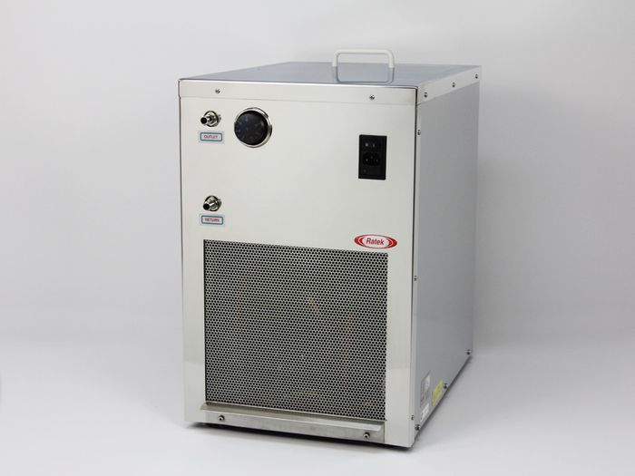 The RC4 Refrigerated waterbath when used with an optional immersion heater circulator will provide accurate temperature controlled water at or below ambient temperatures. The waterbath has a capacity of approximately 12 litres. A built in heavy duty recirculating pump provides closed loop circulation at the rate of 7 litres per minute, and can offer a reliable and preferable alternative to the use of mains water for cooling Heat exchangers, Electrophoresis baths, Condensers, etc. To avoid accidental damage to the heat exchanger components the RC4 cooling is set to turn of at 4°c, however it can be factory set to have a minimum temperature of -10°C if required. Suitable additives would need to be added to the water for the -10°c version to avoid damage to the system. Polished grade 304 stainless steel is used for the tank, and surround, and the main case is constructed from a heavy duty plastic. Heat exchanger components are manufactured from copper. Only environmentally friendly R134a refrigerant is used in Ratek coolers.