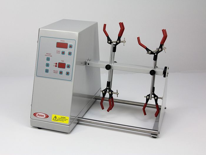 Thorough mixing is achieved with the end over end mixing action. This mixer can be supplied with optional fittings to accommodate a range of flasks Bottles and test tubes. For larger bottles and flasks adjustable 3 prong clamps are the most suitable, each clamp can hold containers from 5-90mm diameter up to 250mm long in their plastic coated jaws. For test tubes a 4 sided adapter with spring clips is used, clips are available for tubes from 1·5ml to 50ml. The rotating bar is mounted with precision ball bearings and is driven by a custom microprocessor controlled drive system, the large digital display can show set speed or actual speed. The inbuilt electronic timer can be set for 0-99 minutes or 0-99 hours, memory buttons allow for up to 3 speed / time patterns to be stored.