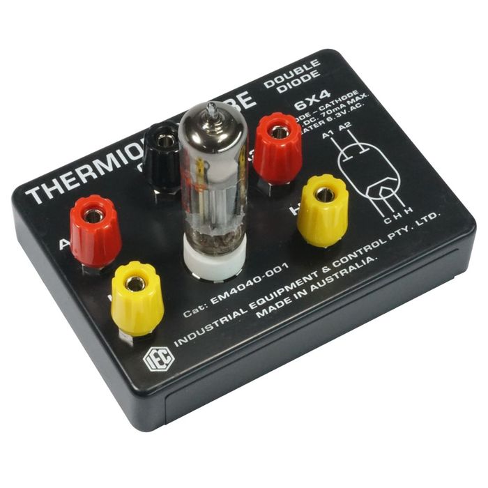 The Thermionic Tube - Diode is a diode tube (or sometimes called an electron valve or electron tube) that rectifies. A heater inside the tube warms the cathode so electrons can emanate. The AC voltage is applied between the Anode (Plate) and the Cathode, but electrons can flow only one direction, therefore the AC is rectified into 'half wave' DC. This diode has 2x Anodes, so the circuit can be configured so that both halves of the AC sine wave can be rectified to produce 'full wave' rectification. 4mm spin free IEC terminals are provided for all connections.