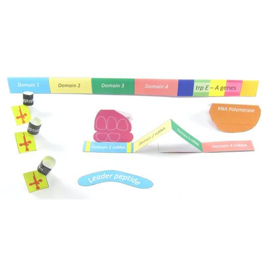 Your students will make a model of the trp attenuator and use it to see how bacteria are able to control trptophan biosynthesis genes. The model covers the trp attenuator, RNA polymerase, Trp leader protein, tRNA and ribosomes.