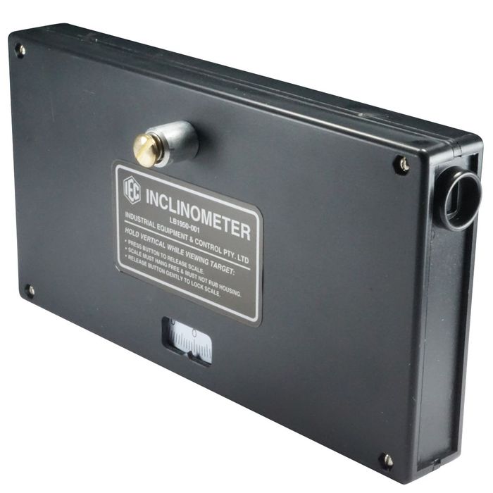 The IEC Inclinometer (or sometimes called clinometer) is a simple and self-contained device for measuring the angle of incline or decline from the observer to an object. The observer looks through the viewing tube and places the object in the centre of the 'sight' at the other end. A button is pressed to release a swinging pendulum graduated in degrees. After a stabilisation time of a few seconds, the button is released to clamp the pendulum firmly. The angle of incline or decline is measured on the scale.