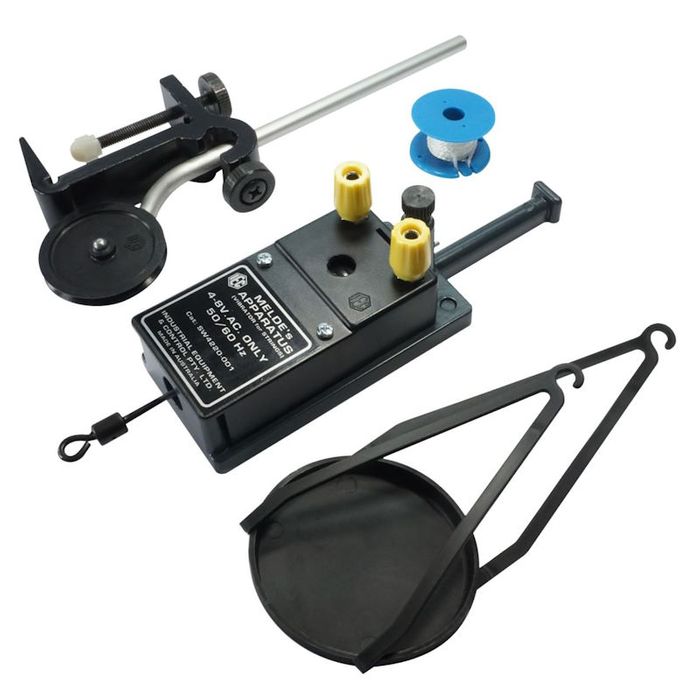 The IEC 'Melde's Apparatus' is a new item that was earlier known as the 'Vibrator'. It is used to vibrate a length of cord horizontally (maybe 1 to 2m length) as it is pulled taut along the surface of a bench and passed over the edge of a table with a weight attached to create a known tension in the cord. The armature (the moving part) of the vibration device has a hole in the tip for the attachment of the cord. The kit includes a bench clamp and a pulley on rod to guide the cord over the bench edge and to be adjusted so that the cord is parallel to the bench top. When a high power Signal Generator is connected to the Melde's Apparatus, the armature is adjusted and clamped to vibrate at this known frequency. The cord it attached and tensions to provide excellent patterns that are measured and studied regarding frequency and wavelength.. | ||