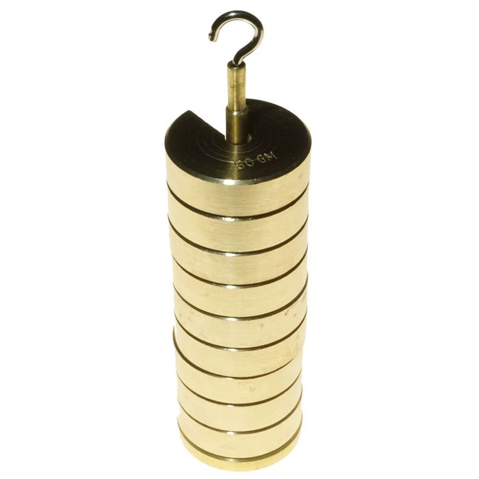 50g Slotted Weight Sets' consists of 9x 50g slotted weights mounted on a 50g brass carrier with a hook. Total weight becomes 500g. Accuracy is 1%. The individual slotted weights and carriers are available separately.