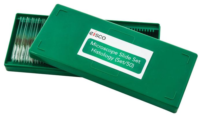 Set of 50, a comprehensive collection of slides covering major animal histology topics. This set comprises the 25 slides contained in set plus the following additional slides. Supplied in a box.Kidney, injected, thick section Squamous eqithelium, isolated cells from mouth Lymphatic, TS Ciliated epithelium Spleen, TS Transitional epithelium, bladder wall, Salivary gland, parotid, TSAdrenal gland, TS Tendon, teasedPituitary gland, TS Hyaline cartilage, Thyroid gland, TS Elastic connective tissue, VS pinna, Tongue, VS, for taste buds, Elastic tissue stain, Stomach wall, cardiac end, VSArticulation, VS joint, Stomach wall, pyloric end, VSSciatic nerve, LS, Colon, TS showing tubular glandsMedulla oblongata, VS, Ureter, TSCerebrum, VS, Spermatoza, smearHeart, LS, entire organ, Cochlea, guinea pig, VS