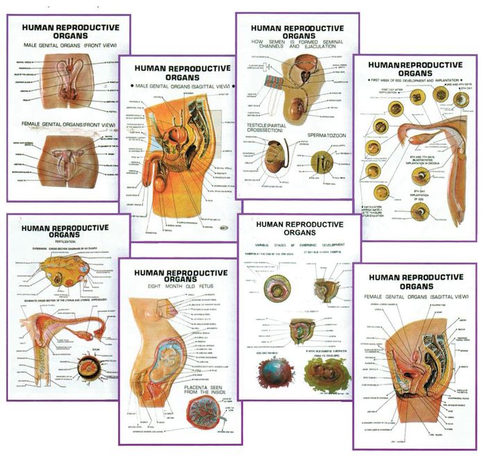 Set of 8 Models covering different topics Human reproductive organs.* Male Genital Organs (Front View) * Male Genital Organs (Sagittal View)* How Semen is formed *First Week of Egg Development and Implantation* Fertilization (Cross Section diagram of Ovary) *Eight Month Old Fetus* Various Stages of Embrionic Development *Female Genital Organs (Sagittal View)Size 25x35 cm