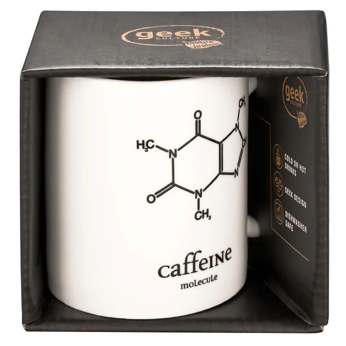 The caffeine molecule emblazoned on a classic white mug is great for your morning coffee fix!