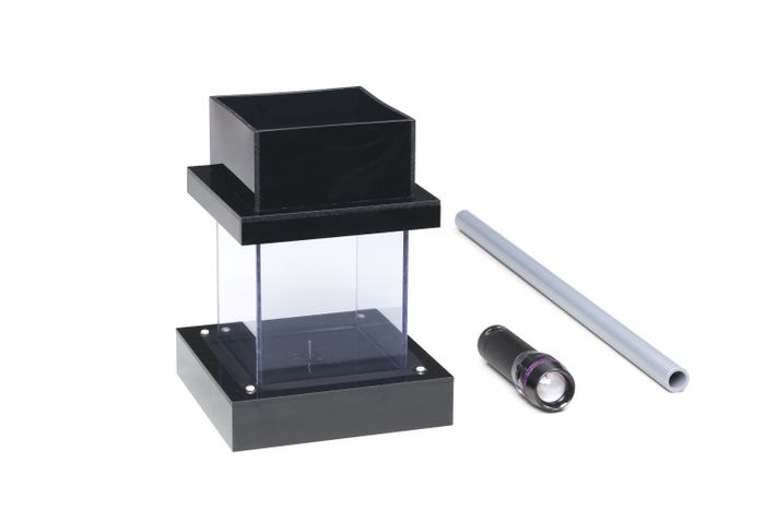 This safe and affordable Cloud Chamber requires no dry ice or liquid nitrogen. Instead, the apparatus uses a specially designed cold plate that is capable of retaining a low temperature for about one hour by freezing the plate in a standard freezer. Tracks of radiation can be observed for about 20 minutes (until ethanol is vaporized) in a room at 25â (77°F). The cold plate can be used repeatedly by freezing it again. The only consumables required to observe radiation tracks are ethanol (99.5%) and hot water (~50° C). Detailed Instruction Guide included.