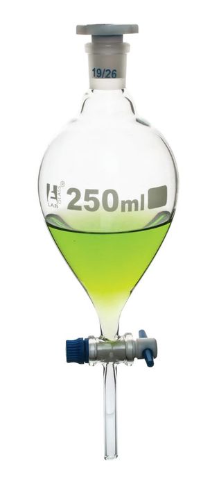 Borosilicate glass with interchangeable plastic stopper and PTFE key stopcock. Cap. 250 ml, Socket size 19/26