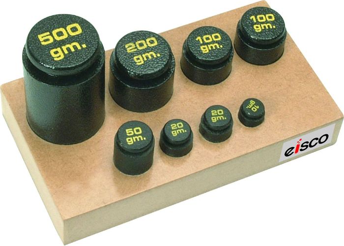 Each piece individually machined for high accuracy. Manufactured from Steel shafts. Supplied on wooden block. Set of 8, 1 of each 500 g 200 g 50 g 10 g and 2 of each 100 g and 20 g