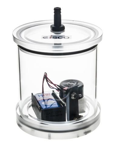 Without air or matter, sound waves cannot travel and therefore cannot be heard. This bell jar effectively demonstrates this concept using a battery–operated buzzer housed inside an acrylic tube. When the buzzer is placed beneath the jar and a vacuum seal is created in the chamber, students will observe a total absence of sound. Once air is returned to the chamber, the sound of the buzzer can be heard once more. Activity requires a vacuum pump, not included. Height 14 cm dia. 10 cm.