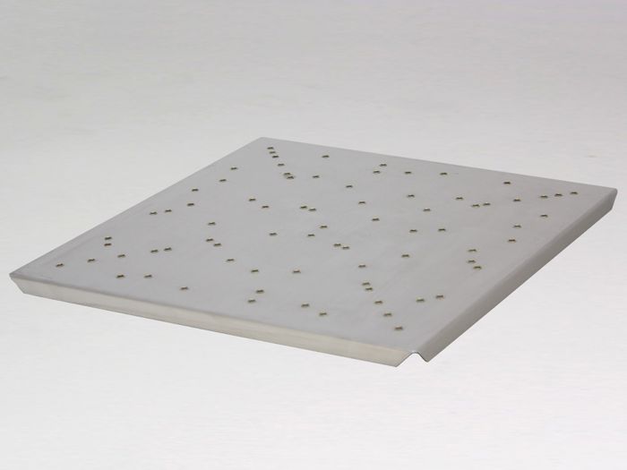 Stainless steel clips are available to suit conical flasks of various sizes. The clips are secured to this mounting tray by screws and can be easily removed or re-arranged. Different sized clips can be used at the same time when required.