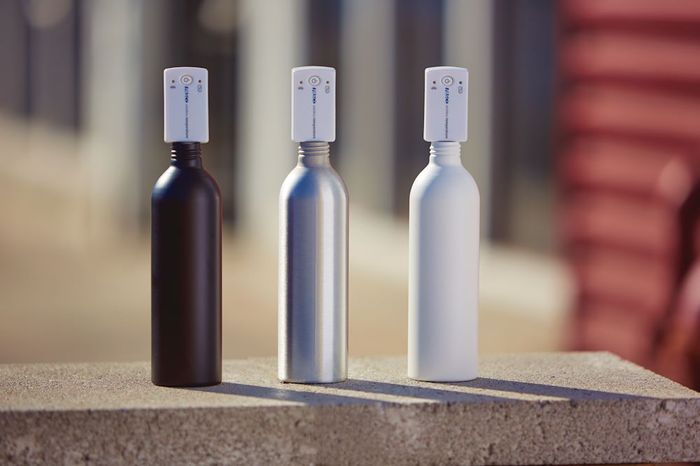 Set of three aluminum cans 15cm high with three different surface finishes: silver (unpainted), white, and flat black. Each can holds ~350ml of water.