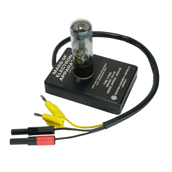 Mass of Electron apparatus is a 'Magic Eye' tube mounted on a base with terminals to accept both heater and plate voltages. A fan of electrons can be seen by viewing through the end of the tube. An Air Cored Solenoid is placed over the tube and a current passed through the solenoid. The field at the centre of the solenoid causes the fan to curve (distort) and this curvature is measured to permit the approximate mass of an electron to be calculated.