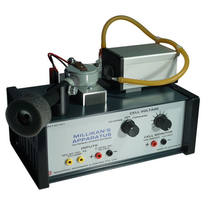 Millikan's apparatus, without inbuilt power sources, permits the atomising of a latex solution into small spheres and the rubber hose induces a static charge upon them. They are introduced between charged plates in the form of a cell. As the voltage between these cell plates is reversed, the particles are attracted to one plate or the other. Their movement is viewed through a small telescope with a graticule. Power sources are required to be connected. Knowing the potential on the cell plates and plotting the velocities of the spheres permits the calculation of the charge on a single electron.