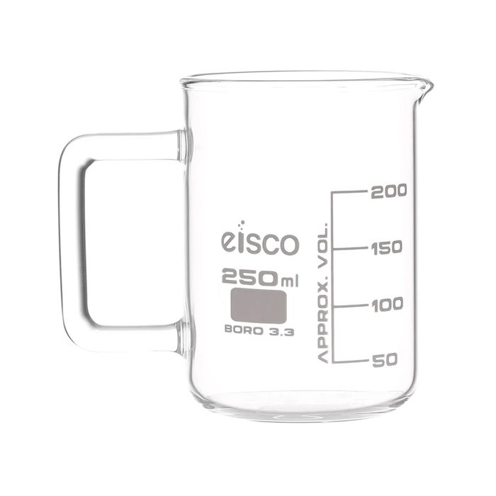 Drink coffee, tea, espresso, or beer like a professional scientist with this 250mL beaker mug with graduations. Made of thick, durable borosilicate glass with an integral handle that is both microwave and dishwasher safe - perfect for holding either hot or cold beverages. Makes a great gift for science lovers. Note: This is not a calibrated vessel; capacity and graduation volumes are an approximation. Wash thoroughly before use.